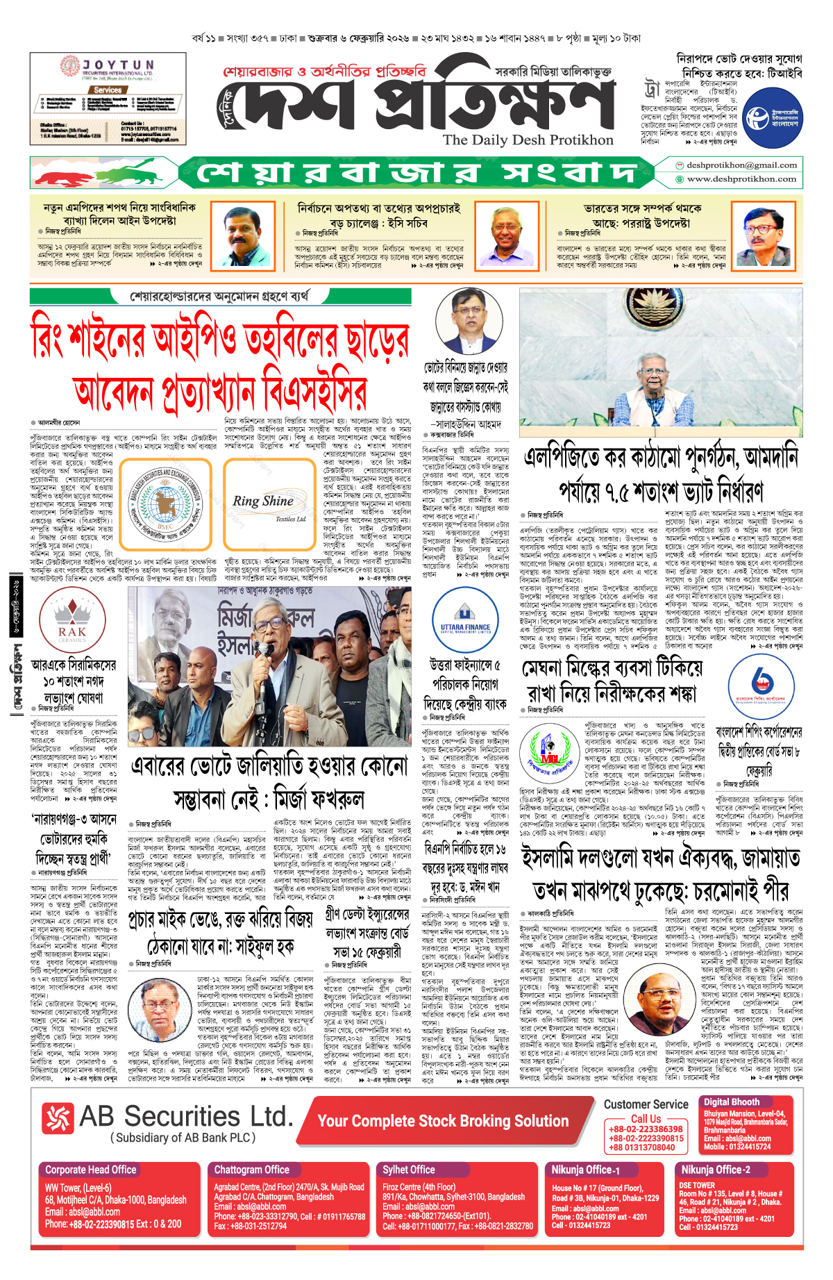 দেশ প্রতিক্ষণ, ঢাকা: সপ্তাহের শেষ কার্যদিবসে দেশের প্রধান পুঁজিবাজার ঢাকা স্টক এক্সচেঞ্জ (ডিএসই) শেয়ার দর পতনের শীর্ষে উঠে এসেছে বস্ত্র খাতের কোম্পানি রিজেন্ট টেক্সটাইল মিলস লিমিটেড। ডিএসই সূত্রে এ তথ্য জানা...