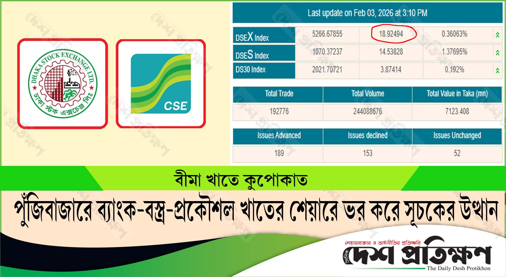 দেশ প্রতিক্ষণ, ঢাকা: সপ্তাহের তৃতীয় কার্যদিবসে দেশের প্রধান পুঁজিবাজার ঢাকা স্টক এক্সচেঞ্জ (ডিএসই) সূচকের উত্থানে লেনদেন শেষ হয়েছে। মুলত ব্যাংক-বস্ত্র এবং প্রকৌশল খাতের শেয়ারে ভর করে সূচকের উত্থান হয়েছে। তবে এদিন বীমা খাতের কোম্পানিগুলোর শেয়ারের...