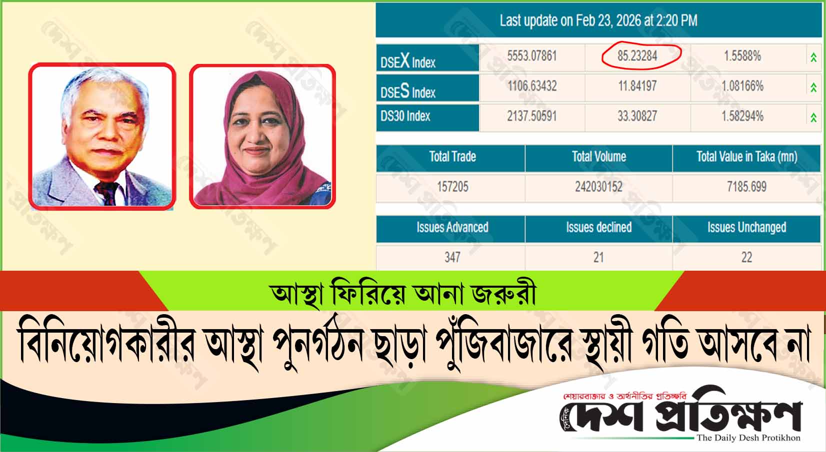 স্পেশাল করেসপন্ডেন্ট, দেশ প্রতিক্ষণ, ঢাকা: পুঁজিবাজার রক্ষার্থে বাংলাদেশ সিকিউরিটিজ অ্যান্ড এক্সচেঞ্জ কমিশন (বিএসইসি) অনতিবিলম্বে পুনর্গঠন এবং বিনিয়োগবান্ধব বাজার গঠনের দাবি জানিয়েছে বাংলাদেশ ক্যাপিটাল মার্কেট ইনভেস্টর অ্যাসোসিয়েশন (বিসিএমআইএ)। বর্তমান চেয়ারম্যান খন্দকার রাশেদ মাকসুদকে ‘অযোগ্য ও অভিজ্ঞতাহীন’ আখ্যা...