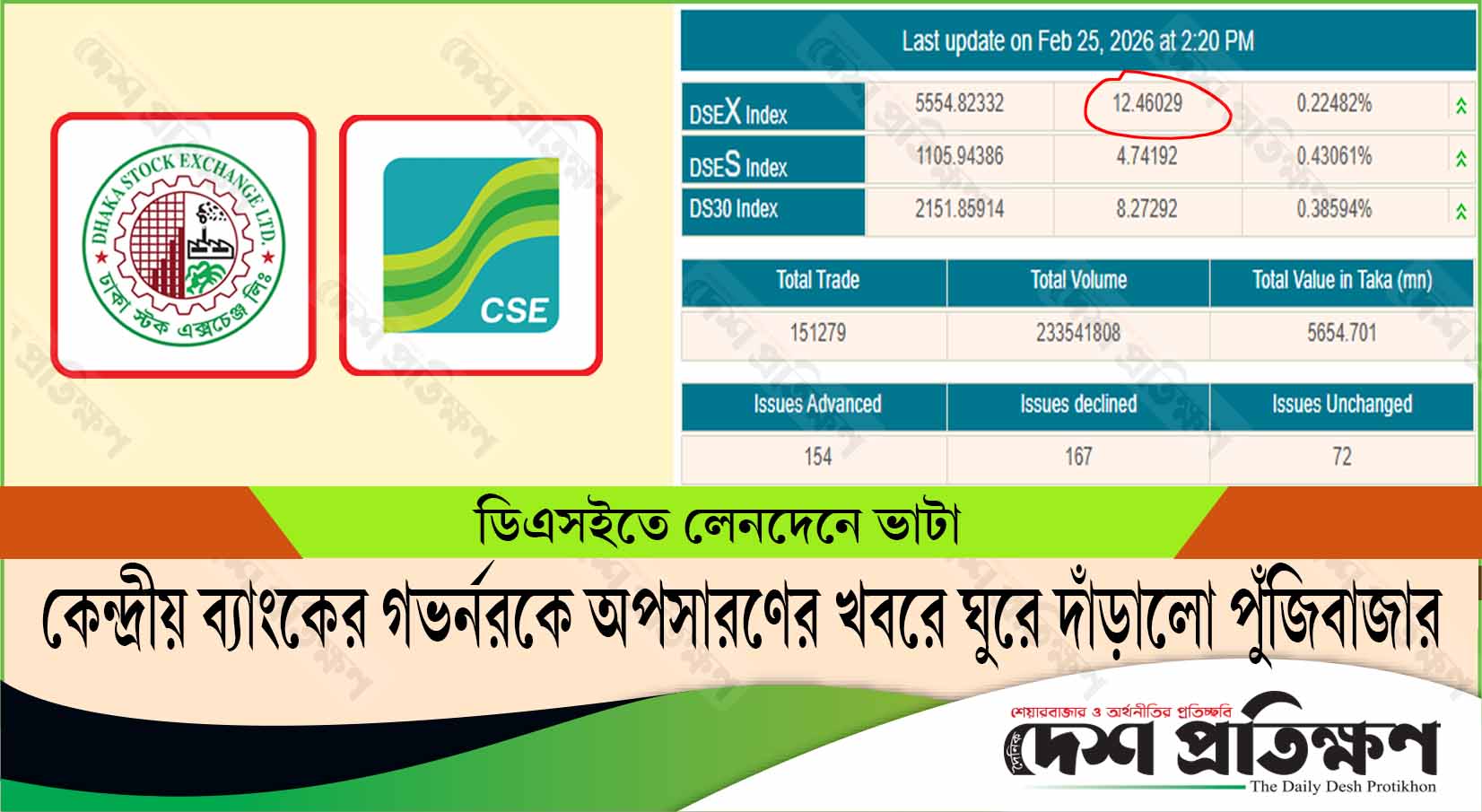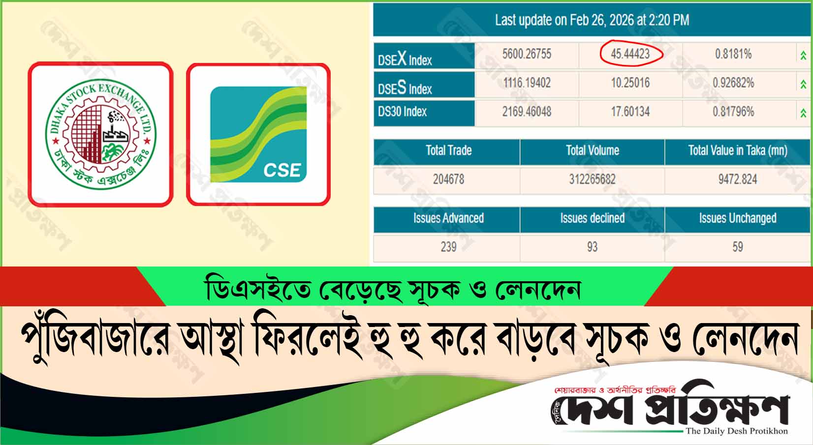 আলমগীর হোসেন, স্পেশাল করেসপন্ডেন্ট, দেশ প্রতিক্ষণ, ঢাকা: সপ্তাহের শেষ কার্যদিবসে দেশের প্রধান পুঁজিবাজার ঢাকা স্টক এক্সচেঞ্জ (ডিএসই) সূচকের কিছুটা উত্থানে লেনদেন শেষ হয়েছে। ফলে টানা চার কার্যদিবস দরপতনের পর গত দু’কার্যদিবস সূচকের কিছুটা ঊর্ধ্বমুখী ধারায়...