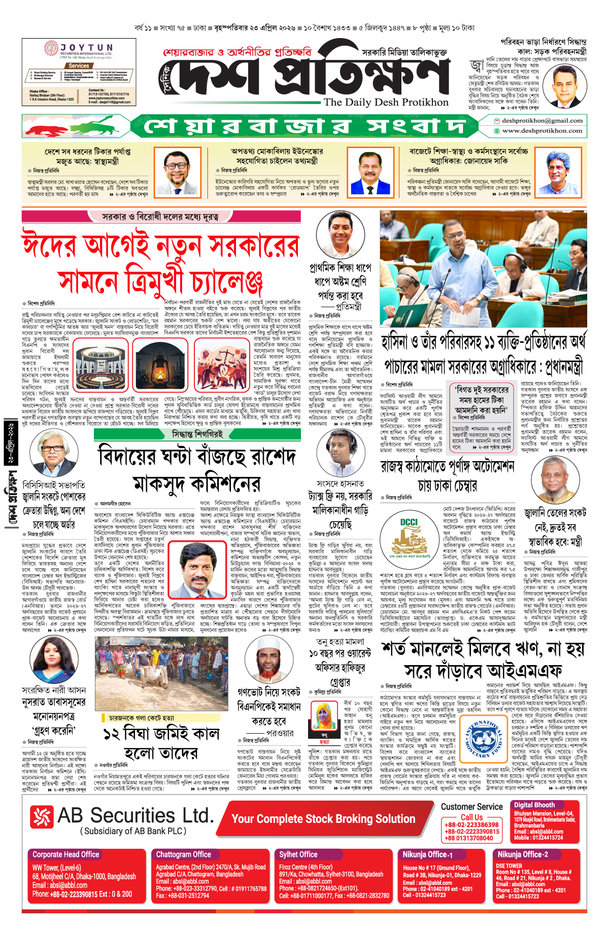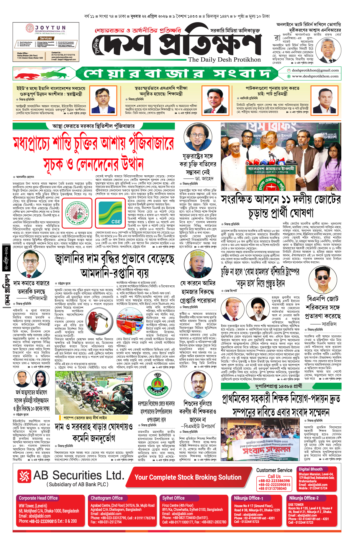আলমগীর হোসেন, স্পেশাল করেসপন্ডেন্ট, দেশ প্রতিক্ষণ, ঢাকা: মধ্যপ্রাচ্যের টানা সংঘাত থামার সম্ভাবনা তৈরি হওয়ায় সপ্তাহের তৃতীয় কার্যদিবসে দেশের প্রধান পুঁজিবাজার ঢাকা স্টক এক্সচেঞ্জ (ডিএসই) সূচকের কিছুটা উত্থানে লেনদেন শেষ হয়েছে। ফলে কূটনৈতিক তৎপরতা জোরদার হওয়া...
