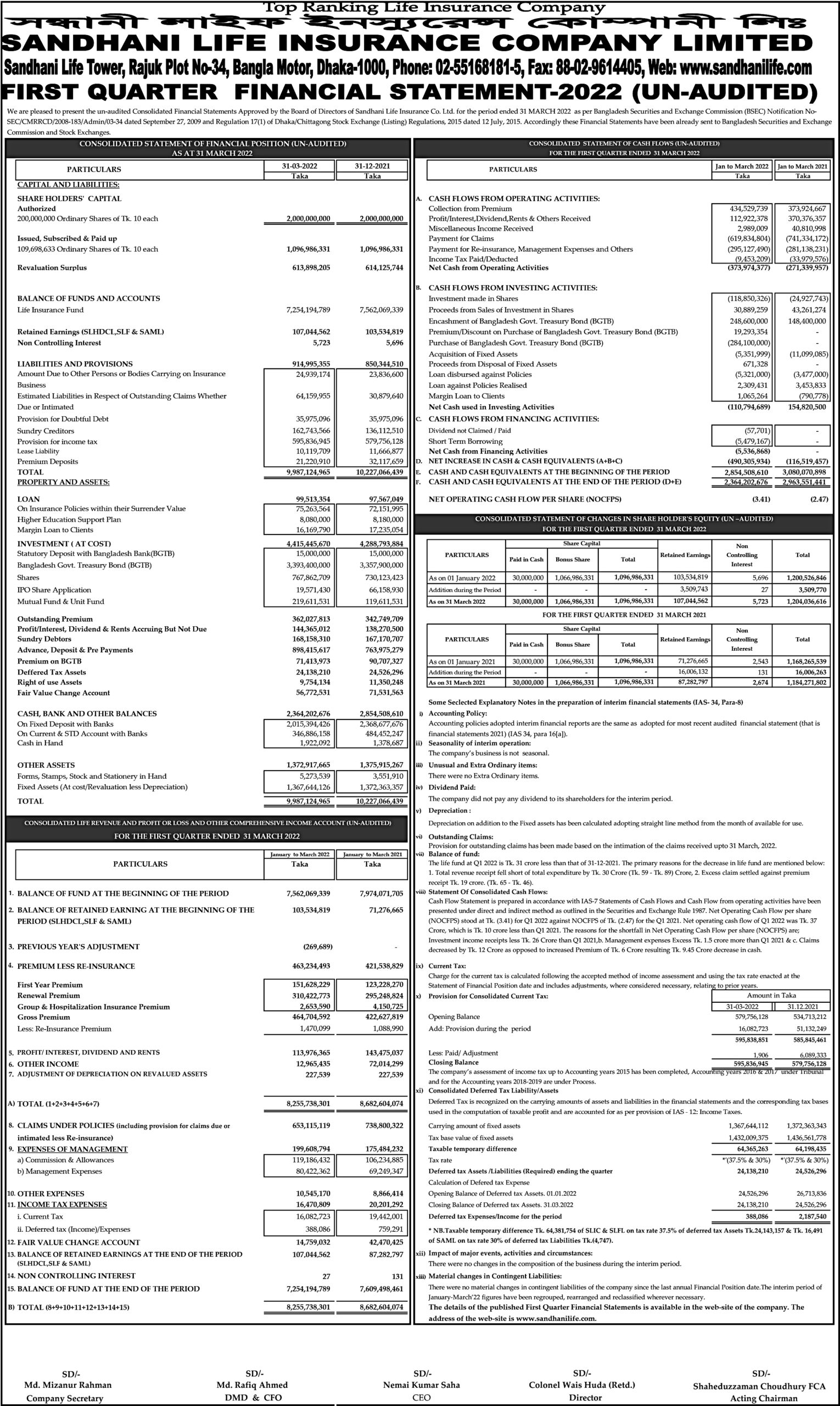 FIRST QUARTER FINANCIAL STATEMENT-2022 (UN-AUDITED) OF SANDHANI LIFE INSURANCE COMPANY LIMITED