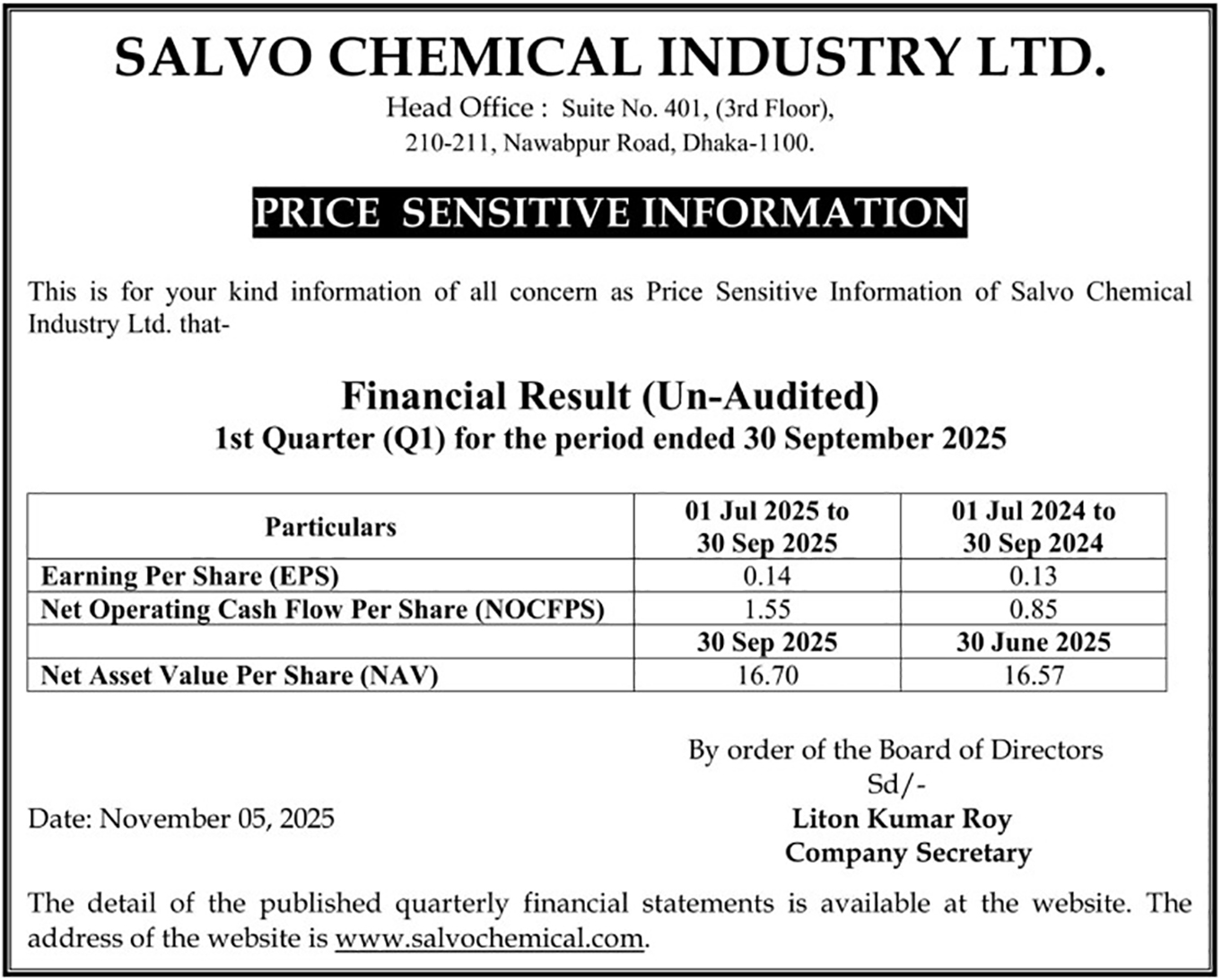 (1Q) Price Sensitive Information of Salvo Chemical Industry Limited