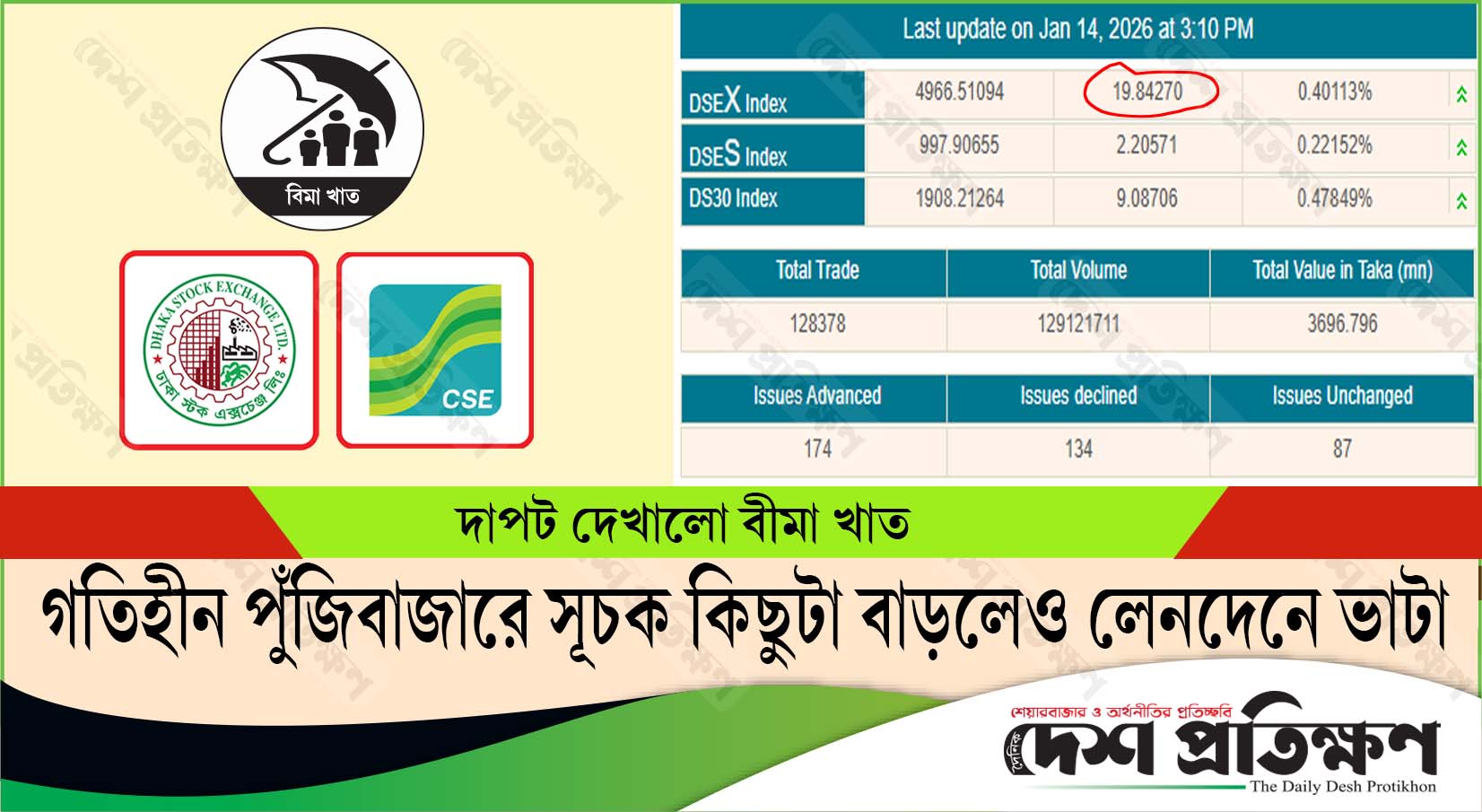 গতিহীন পুঁজিবাজারে সূচক কিছুটা বাড়লেও লেনদেনে ভাটা, দাপট বীমা খাতের