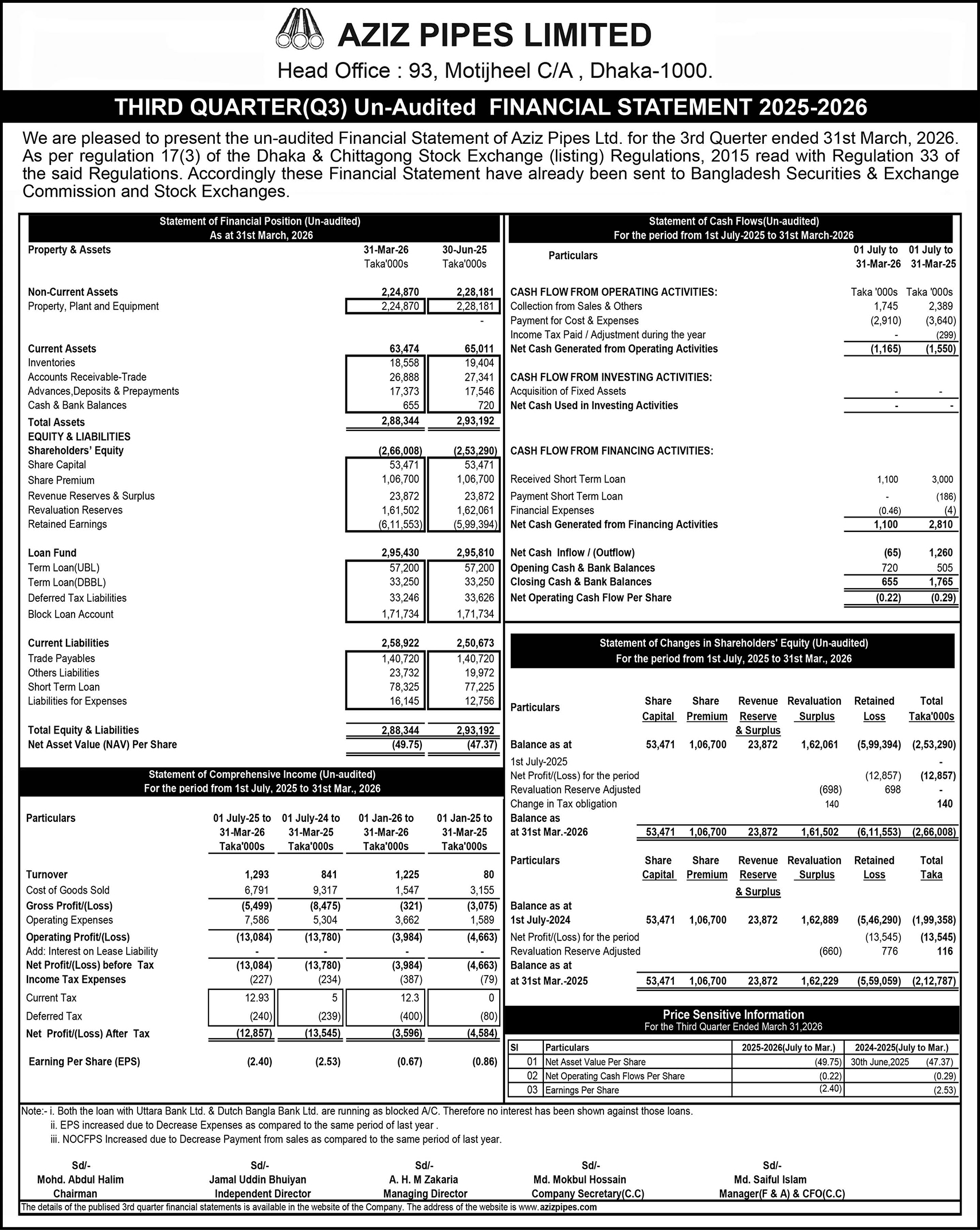 (Q3) Un-Audited Financial Statement 2025-2026 of Aziz Pipes Limited