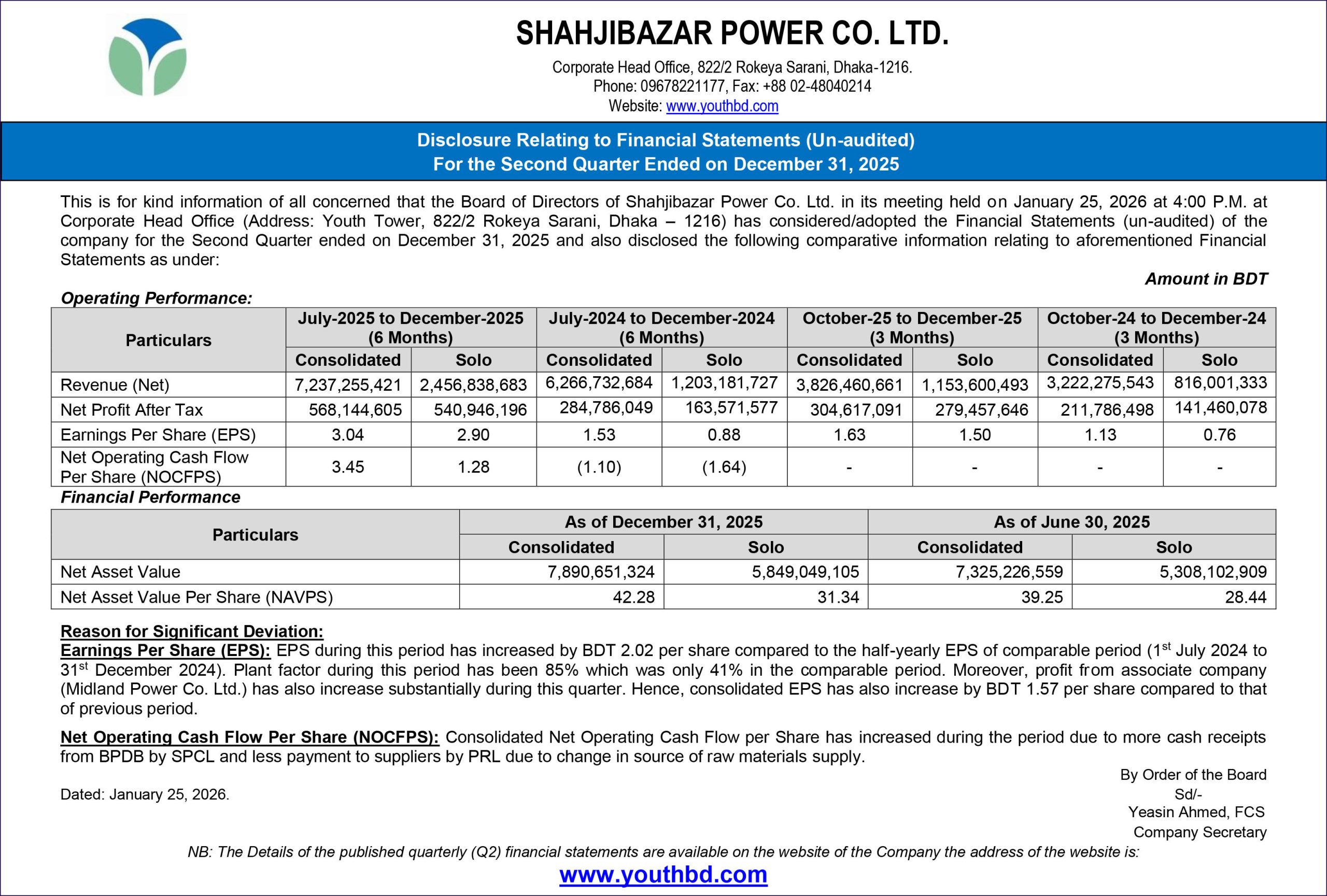 (2Q) Disclosure Relating to Financial Statement of Shahjibazar Power Co. Ltd