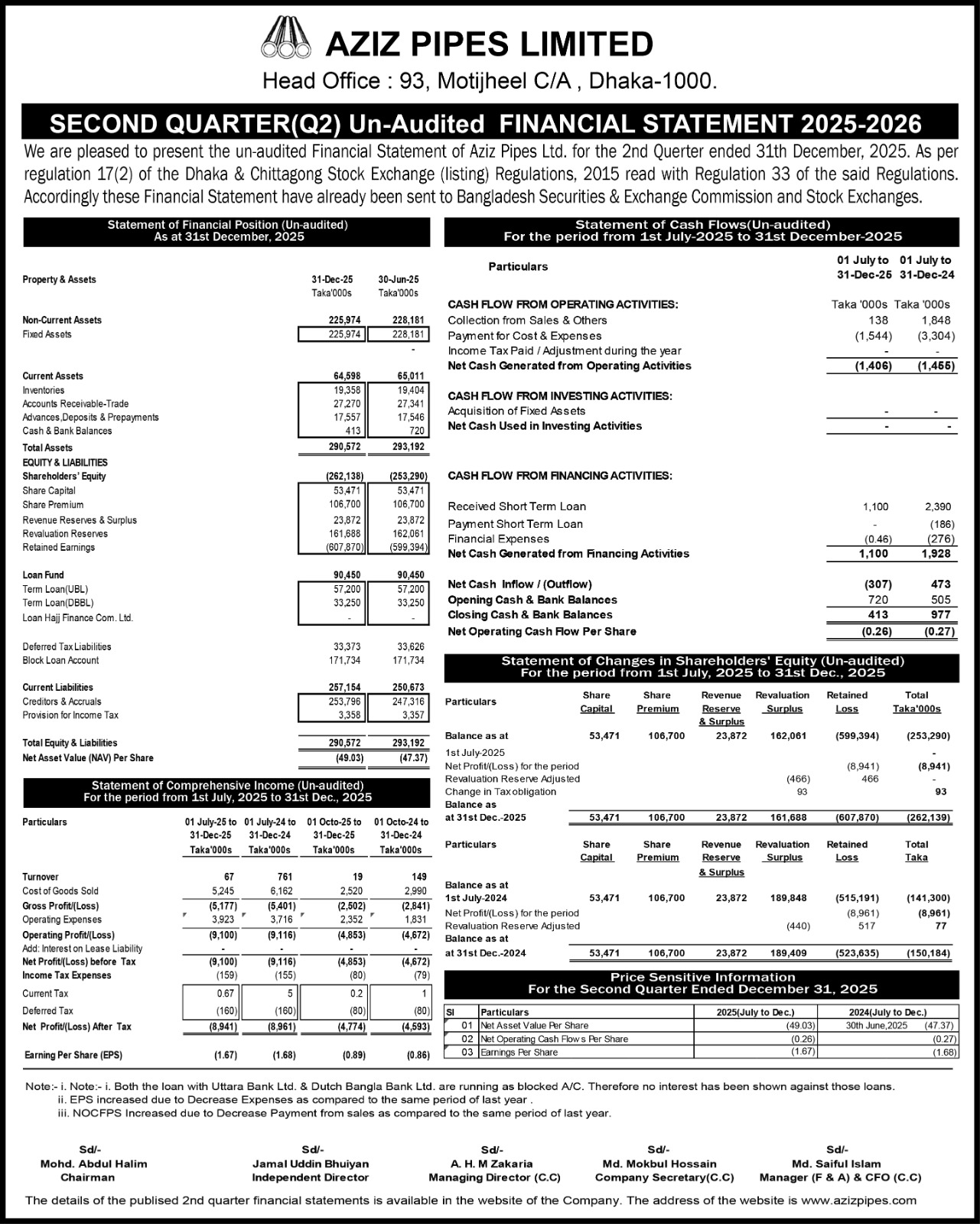 (2Q) Price Sensitive Information of Aziz Pipes-Limited