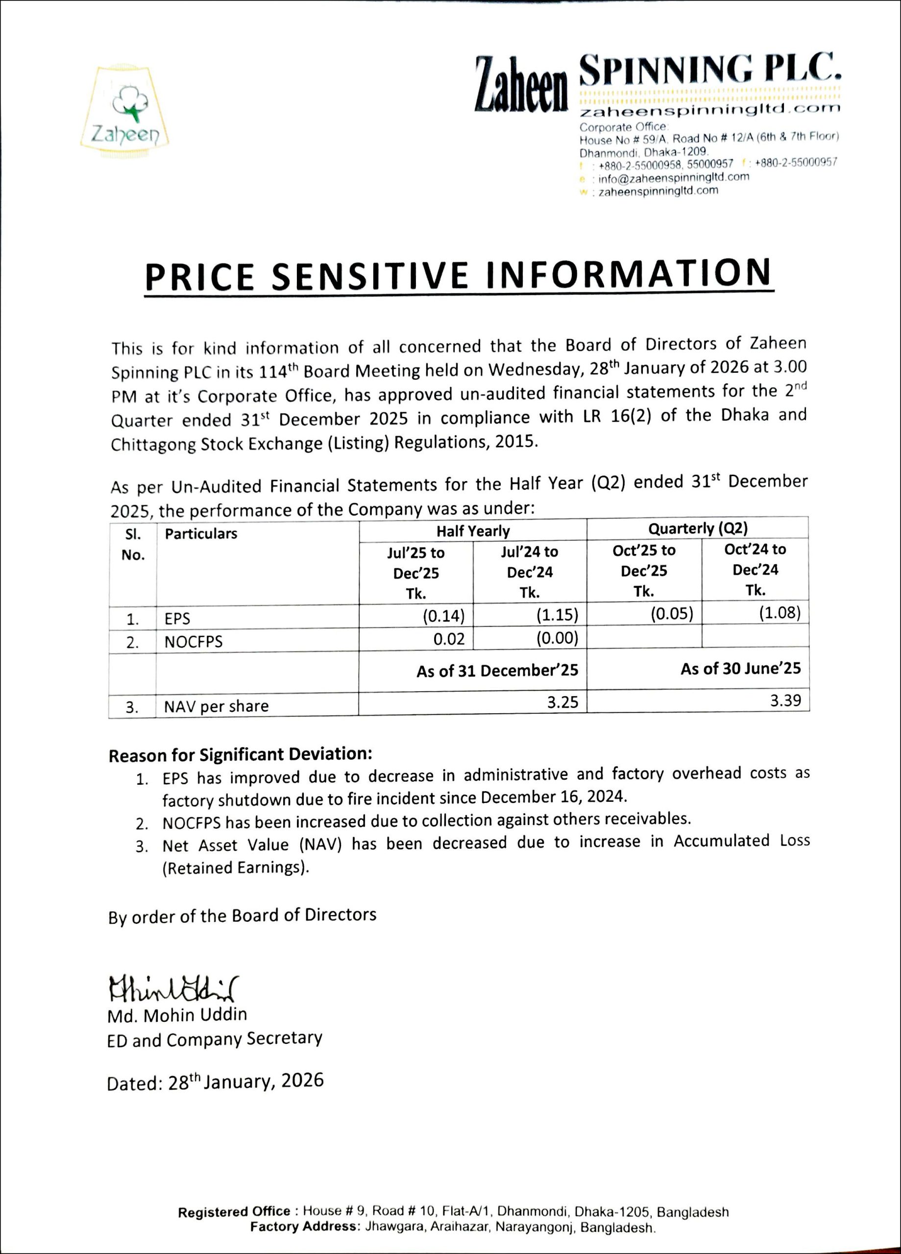 (2Q) Price Sensitive Information of Zaheen Spinning PLC.