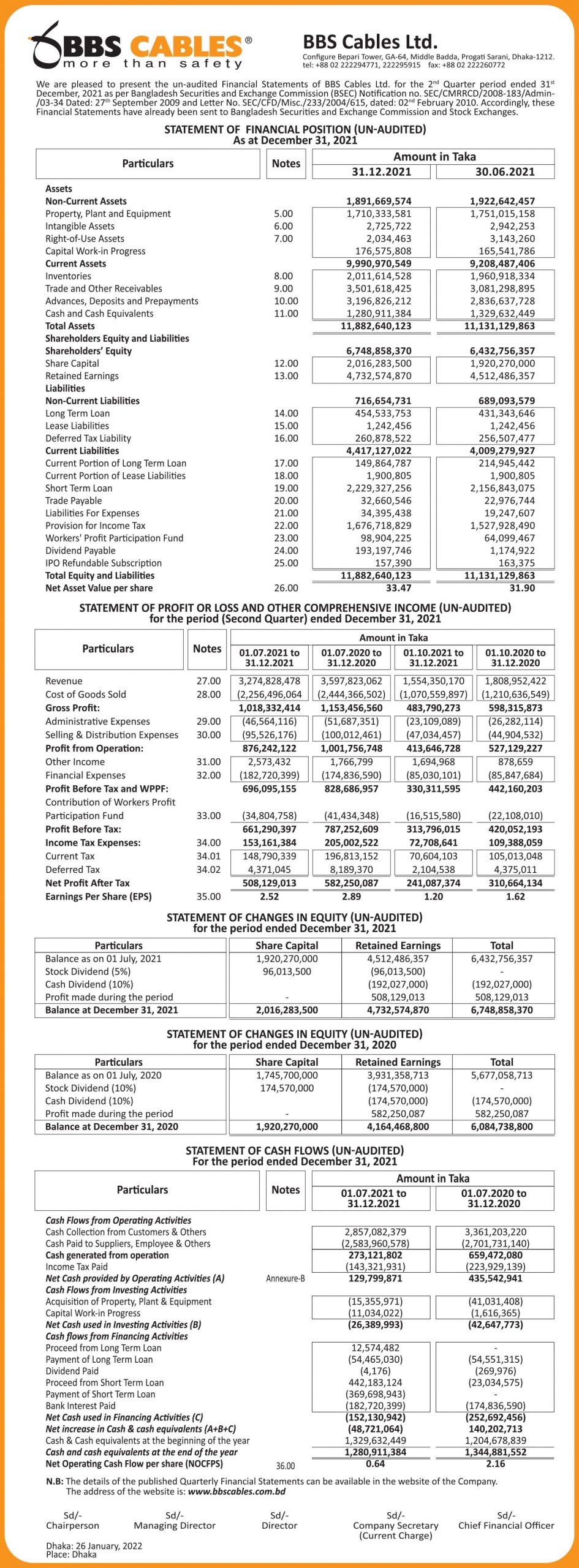 (2Q) Statement of Financial Position (Un-Audited) of BBS Cables Ltd.