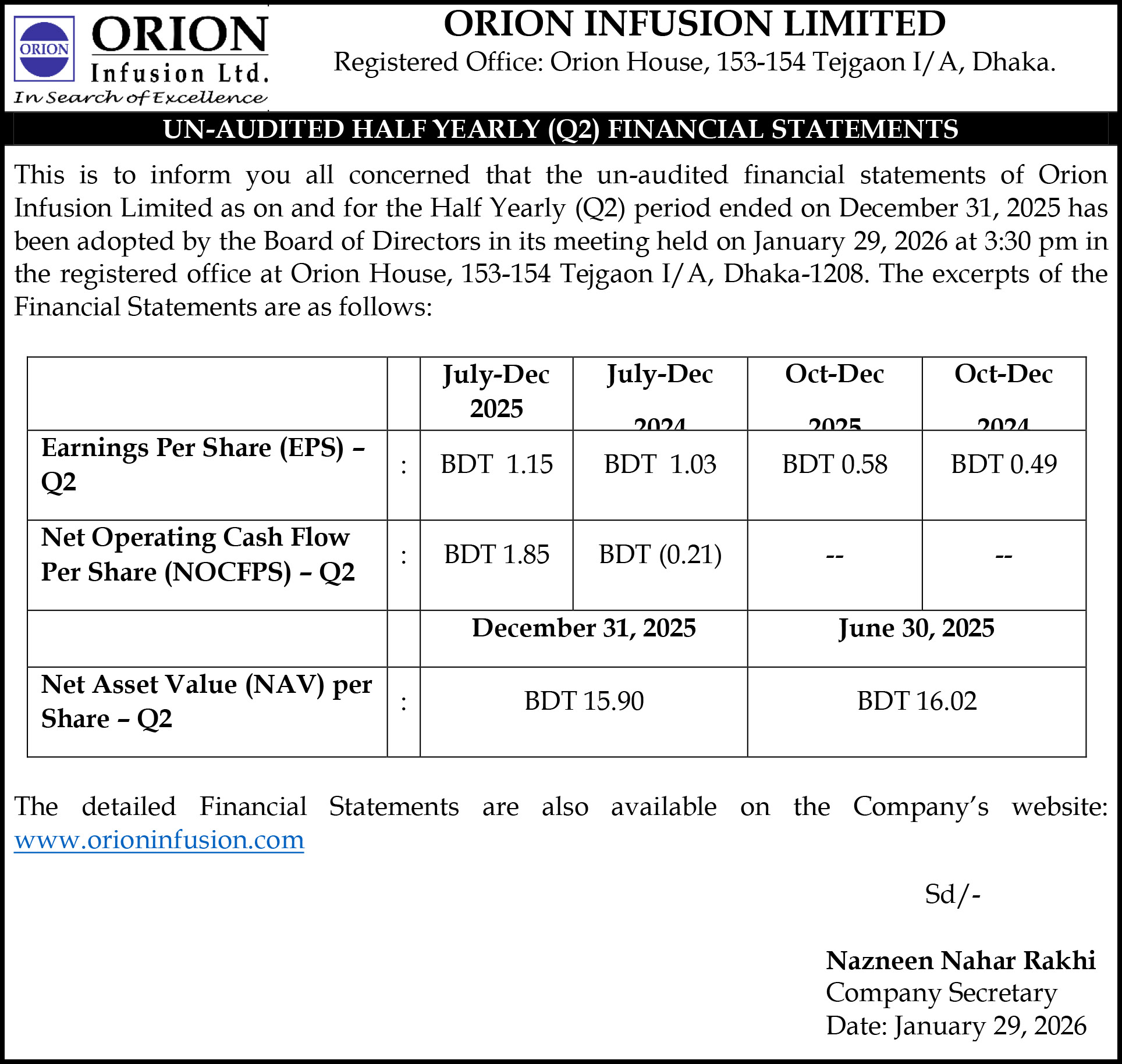 (2Q) Un-Audited Financial Statements of Orion Infusion Ltd