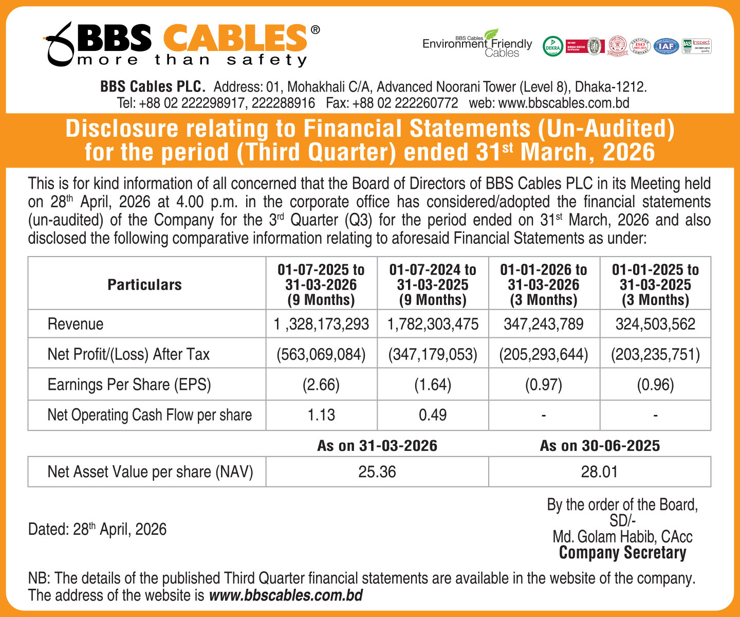 (3Q) financial statements (Un-audited) of BBS Cables Ltd