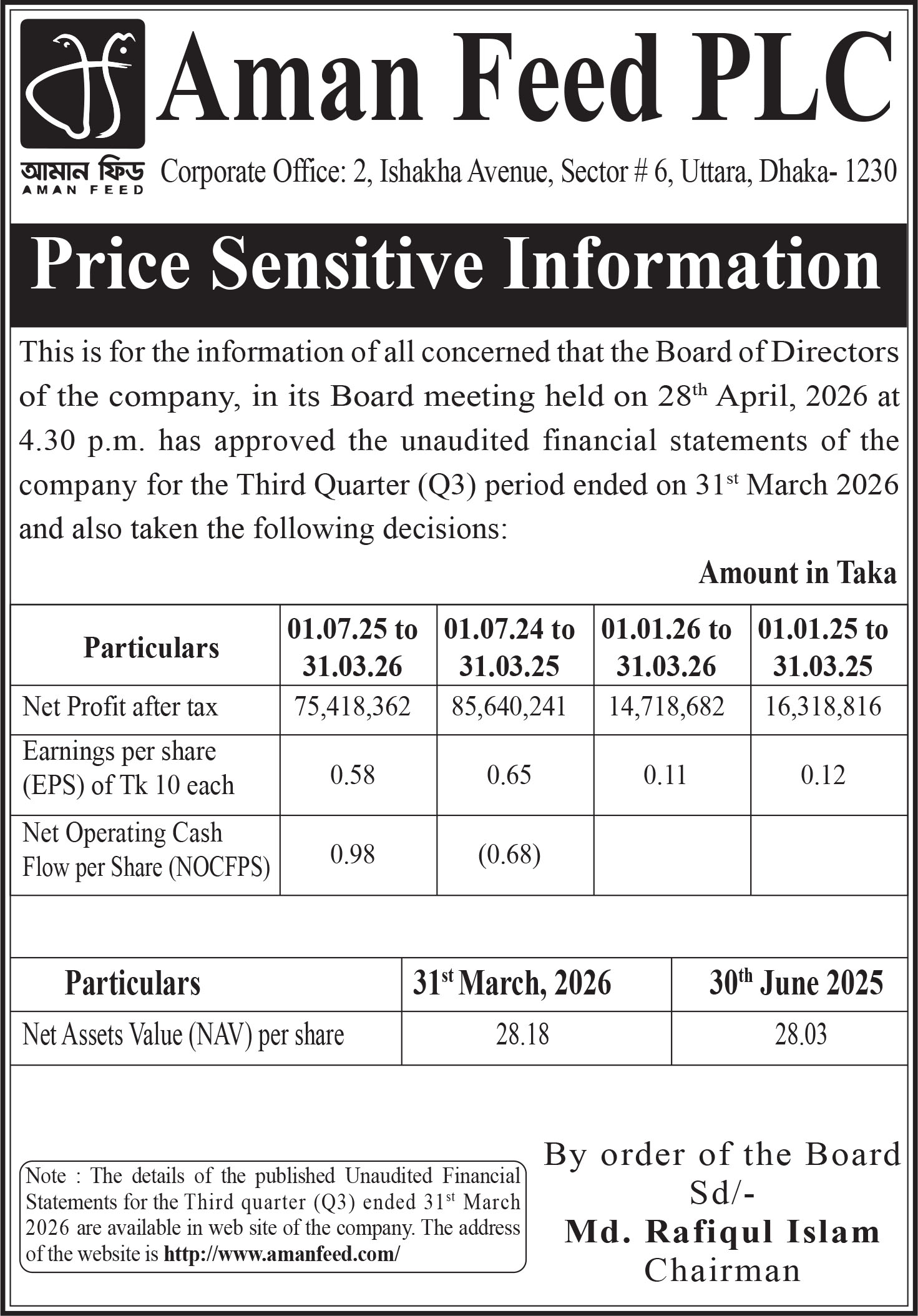3Q Price Sensitive Information of Aman Feed PLC.