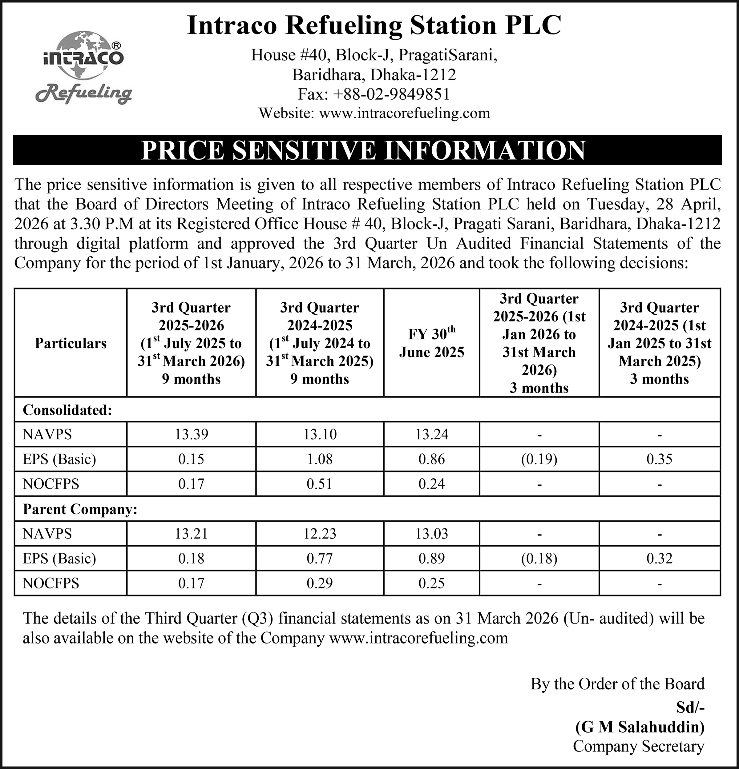 (3Q) Price Sensitive Information of Intraco Refueling Station PLC.