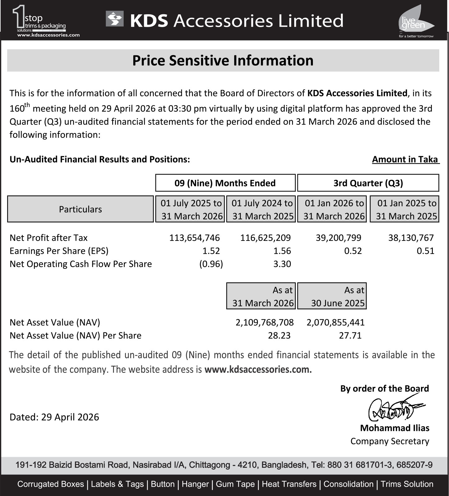 3Q Price Sensitive Information of KDS Accessories Ltd