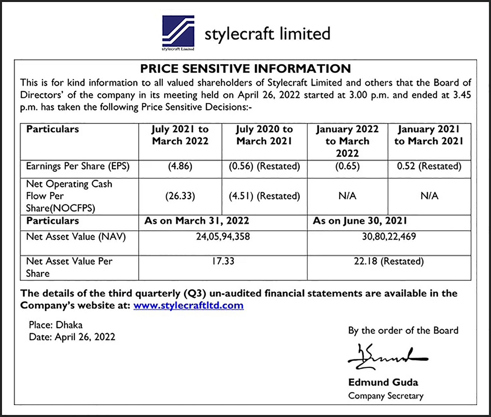 (3Q) Price Sensitive Information Of Stylecraft Limited