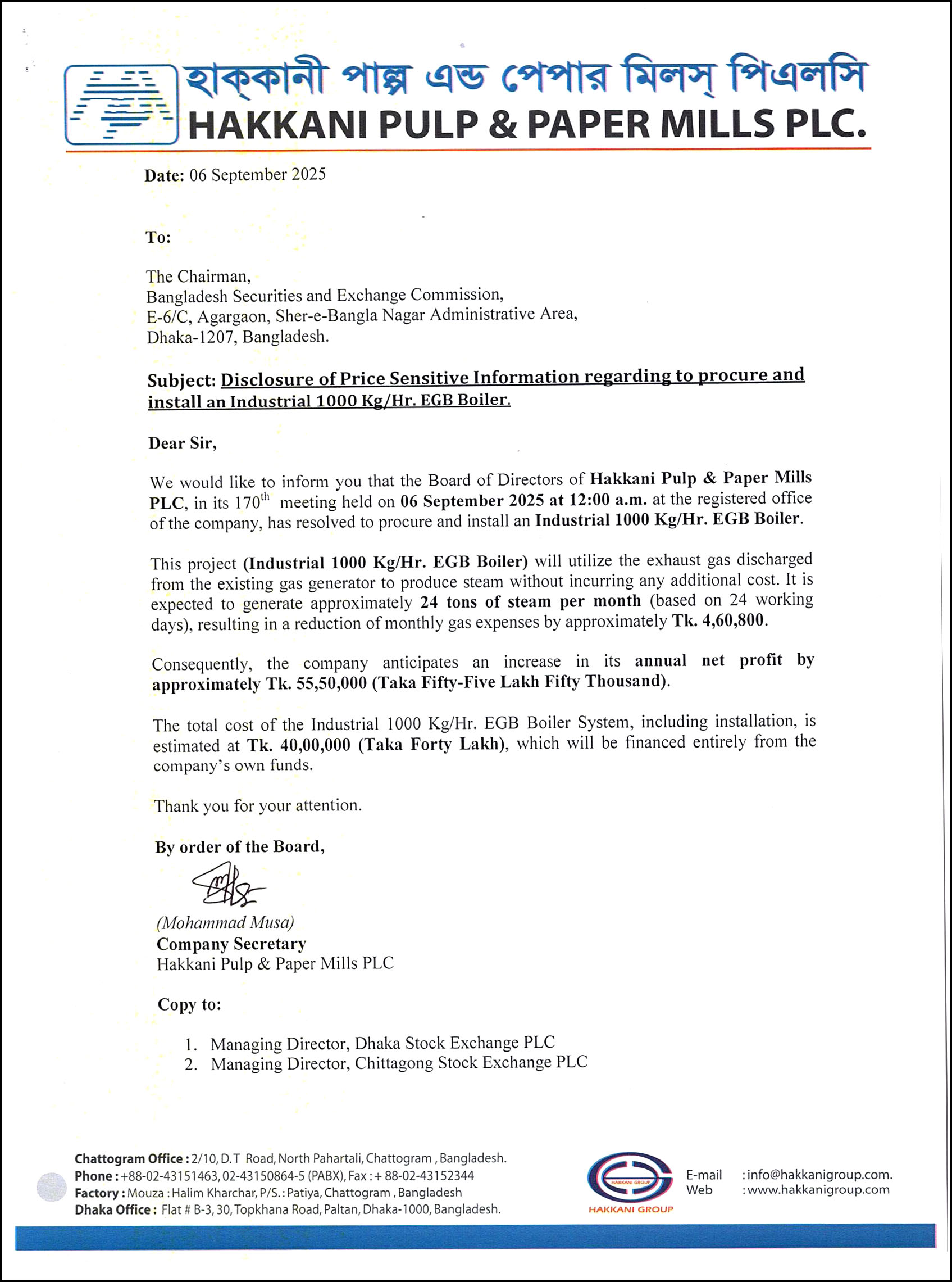 Disclosure of Price Sensitive Information regarding to procure and install an Industrial 1000 Kg/Hr. EGB Boiler.