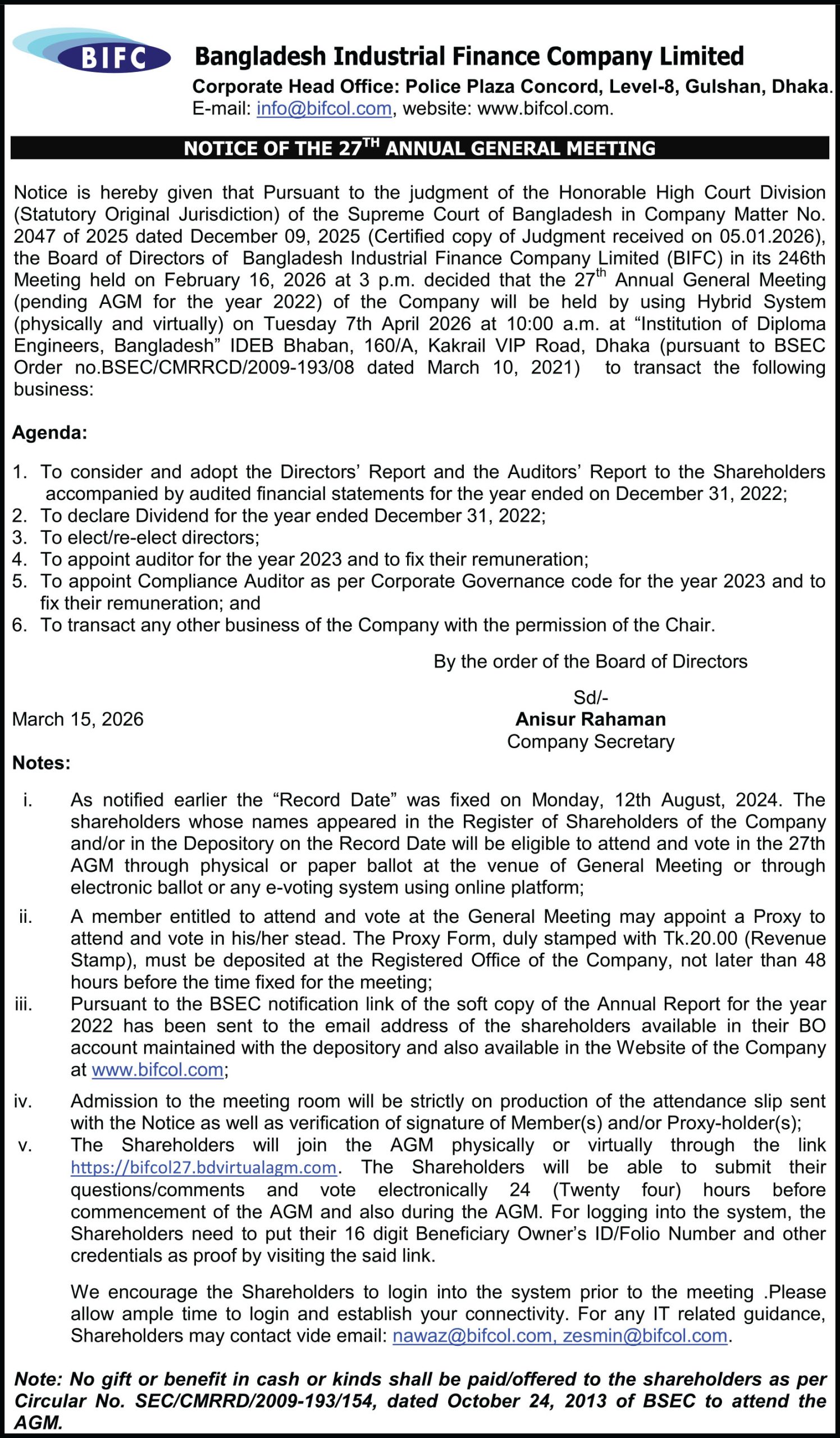 NOTICE OF THE 27TH ANNUAL GENERAL MEETING of Bangladesh Industrial Finance Company Limited