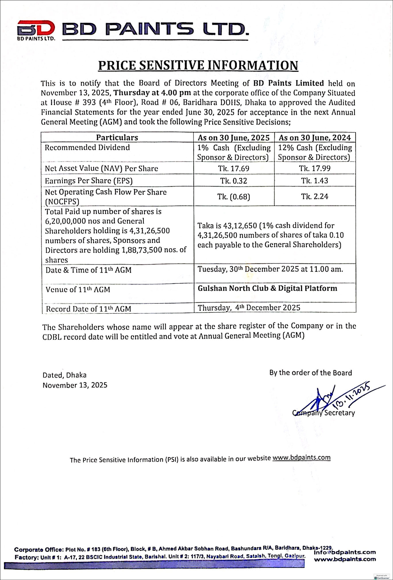 Price Sensitive Information of BD Paints Ltd.