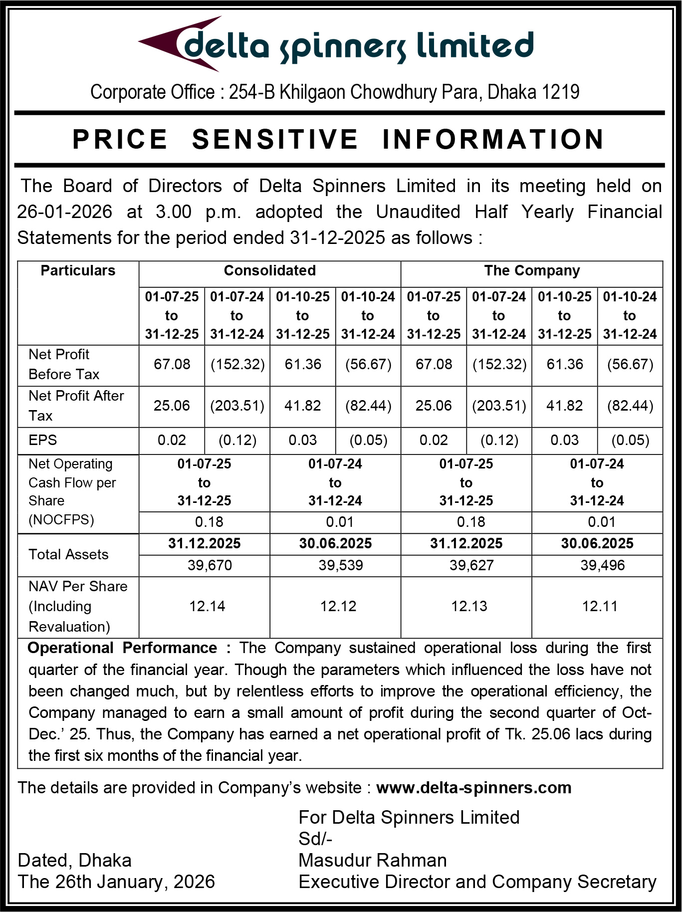 Price Sensitive Information Of Delta Spinners Limited.