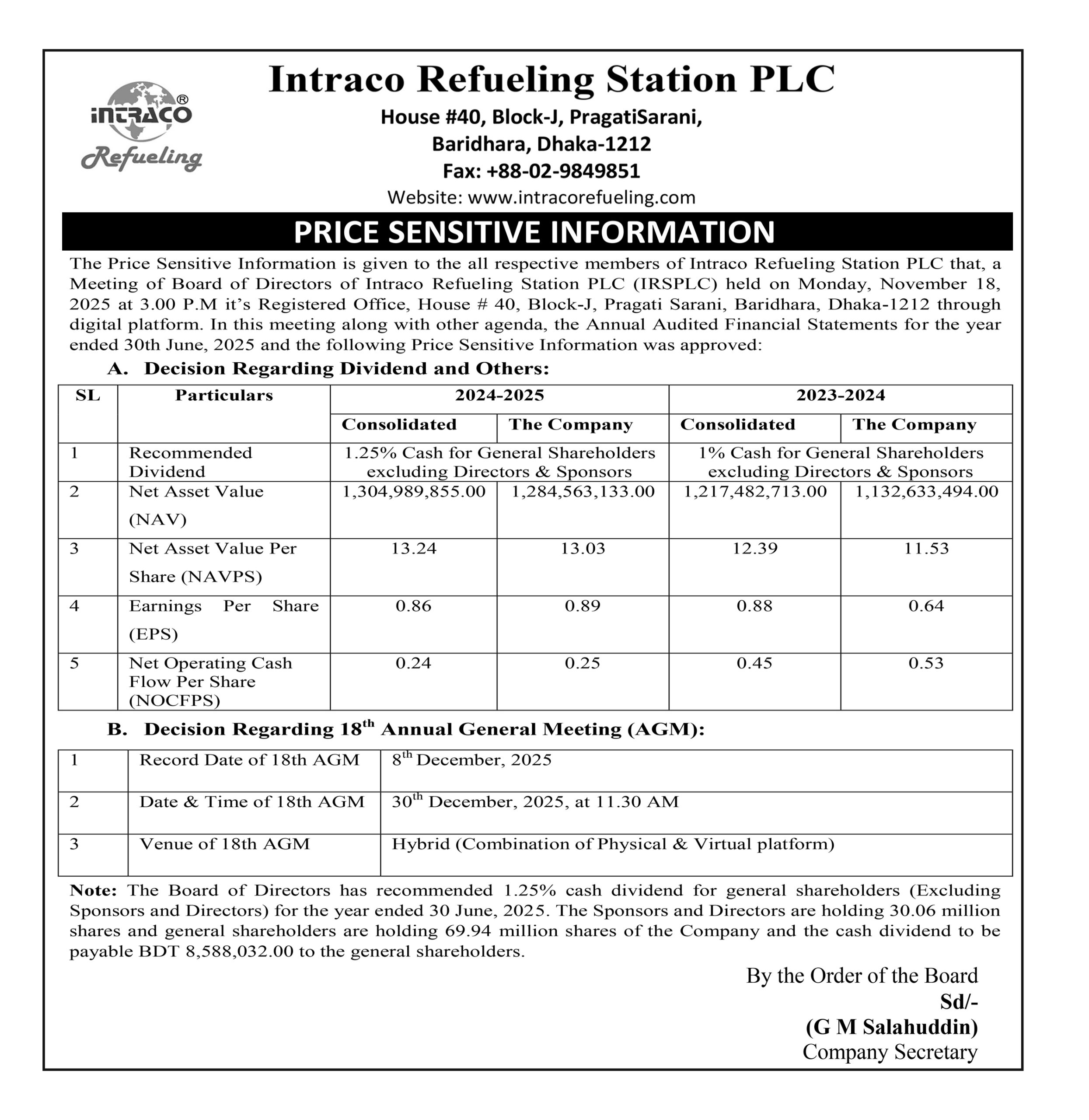 Price Sensitive Information of Intraco Refueling Station PLC.
