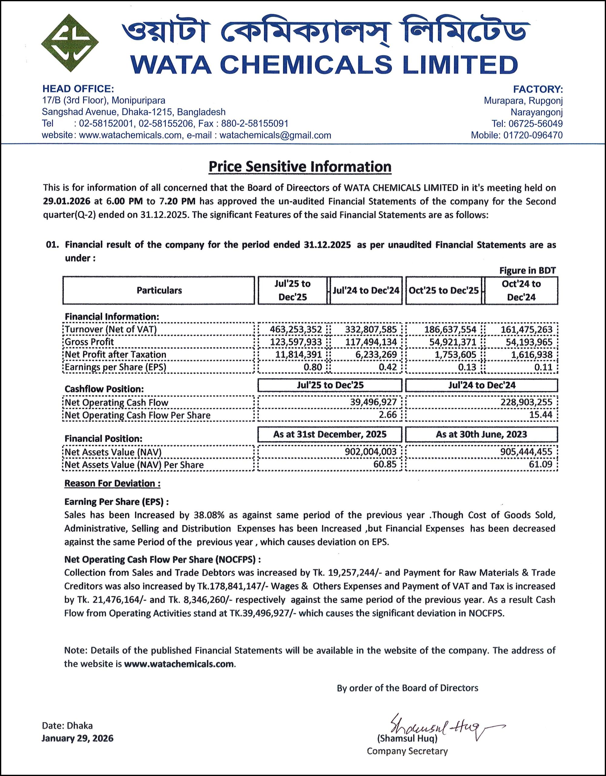 (2Q) Price Sensitive Information of WATA Chemical Limited