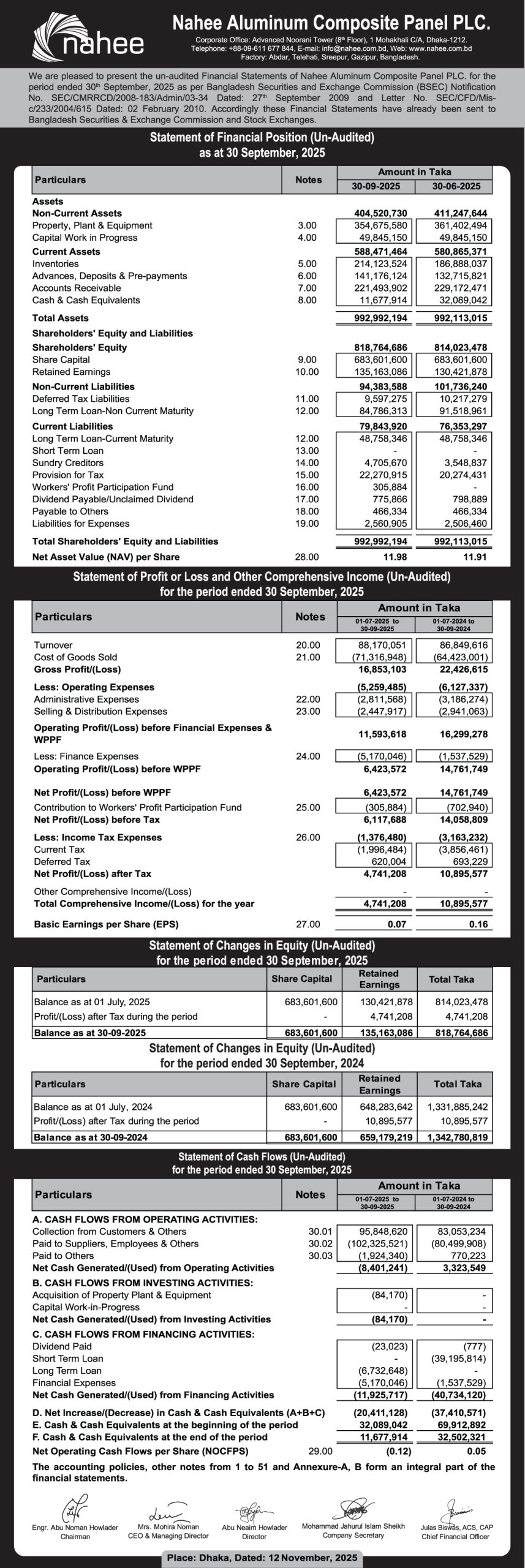 Statement of Financial Position (Un-audited) of Nahee Aluminum Composite Panel PLC.