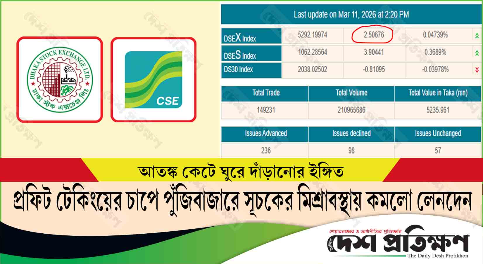প্রফিট টেকিংয়ের চাপে পুঁজিবাজারে সূচকের মিশ্রাবস্থায় কমলো লেনদেন