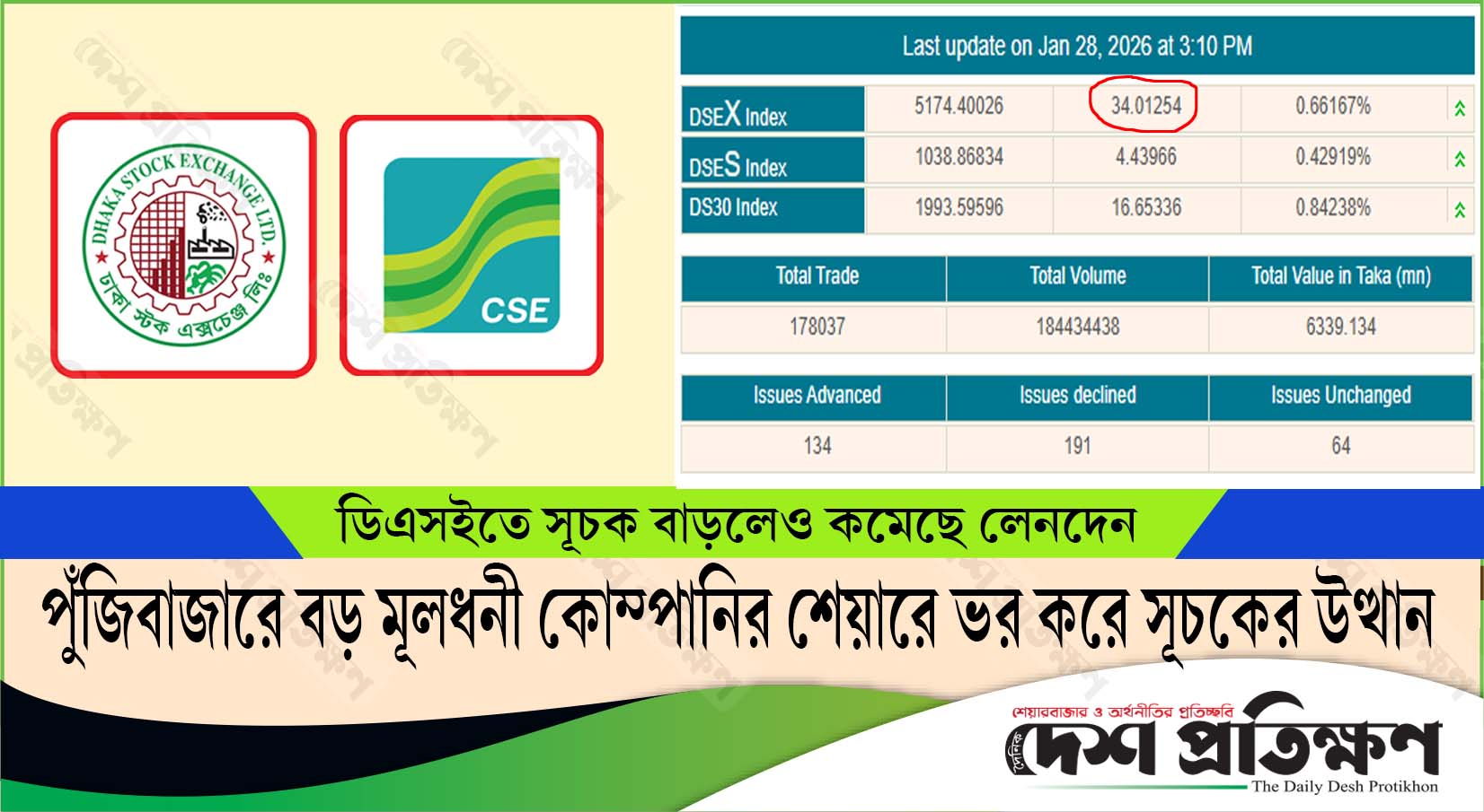পুঁজিবাজারে বড় মূলধনী কোম্পানির শেয়ারে ভর করে সূচকের উত্থান