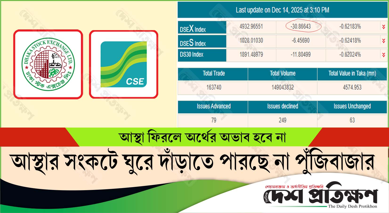 আস্থা সংকটের কারণে ঘুরে দাঁড়াতে পারছে না পুঁজিবাজার, কমেছে লেনদেন
