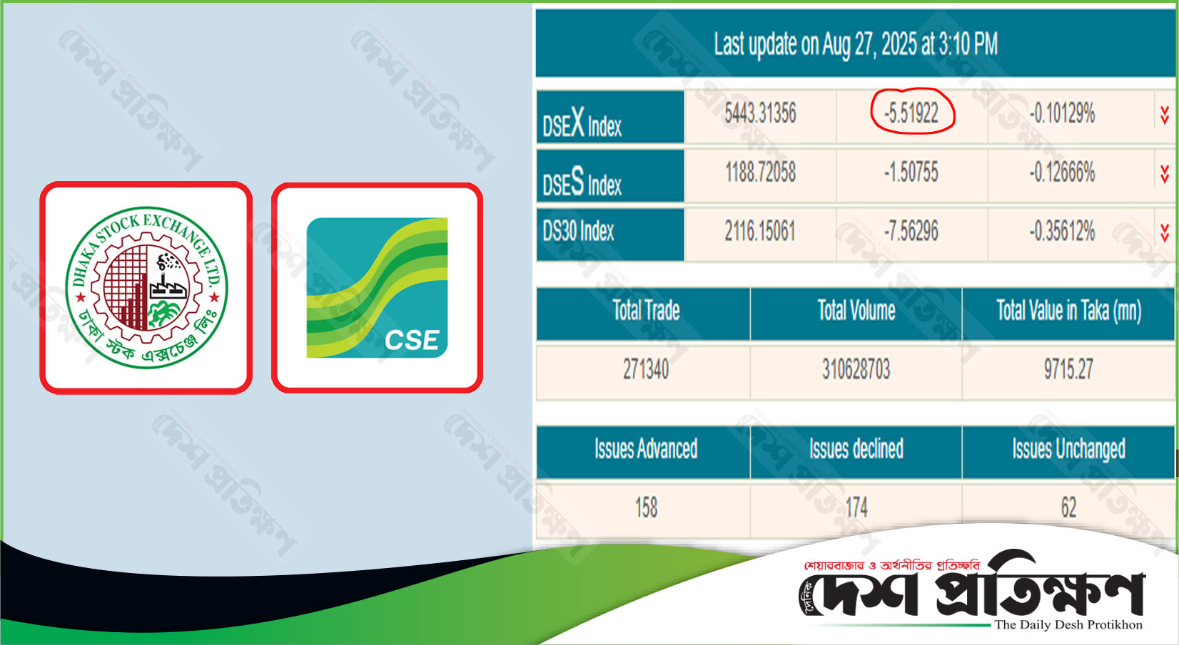 ছয় কার্যদিবসে ডিএসইতে ২৭০, সিএসইতে ৪৫৬ পয়েন্ট সূচক উধাও