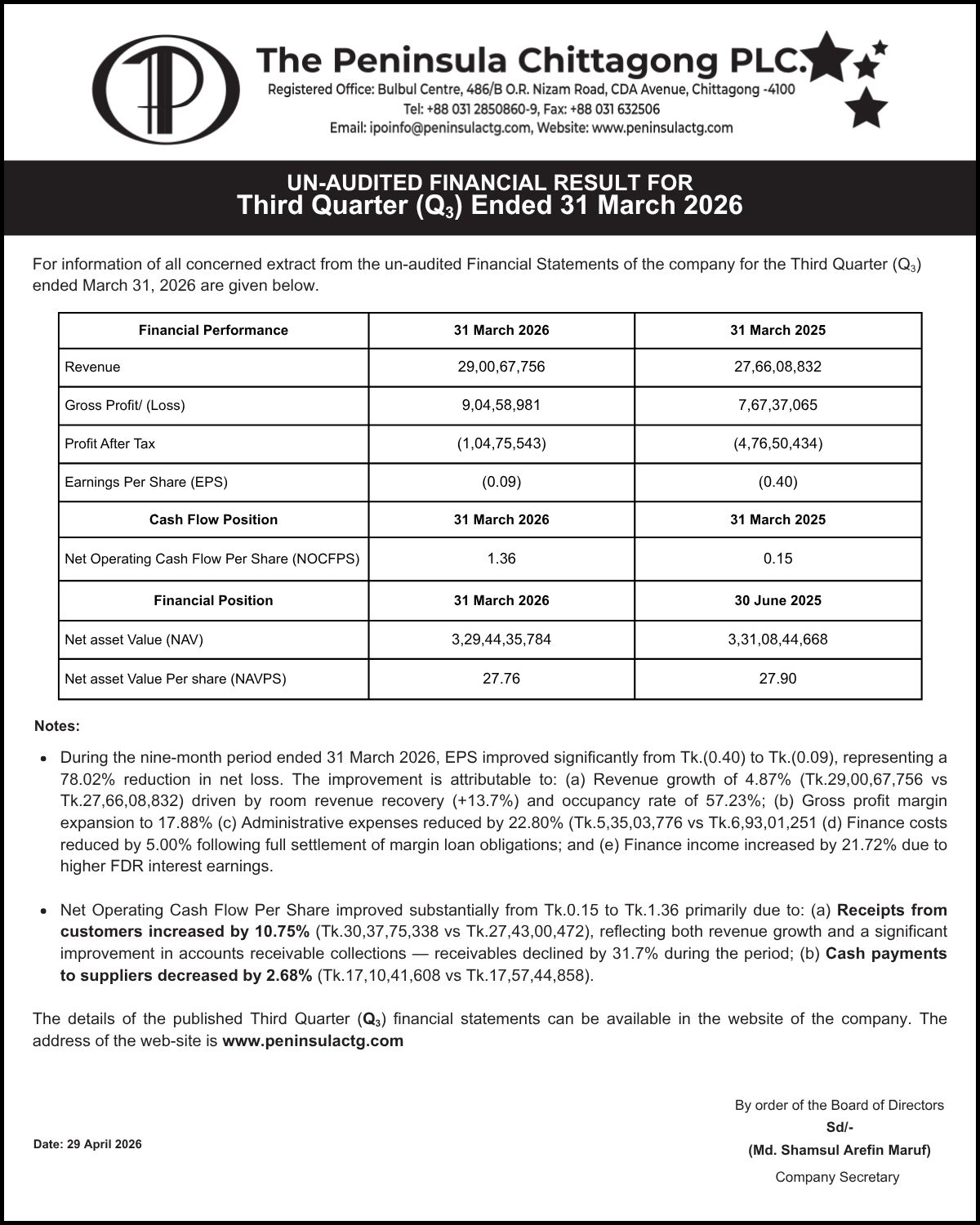 Un-Audited Financial Result For Third Quarter (Q3) of The Peninsula Chittagong PLC.